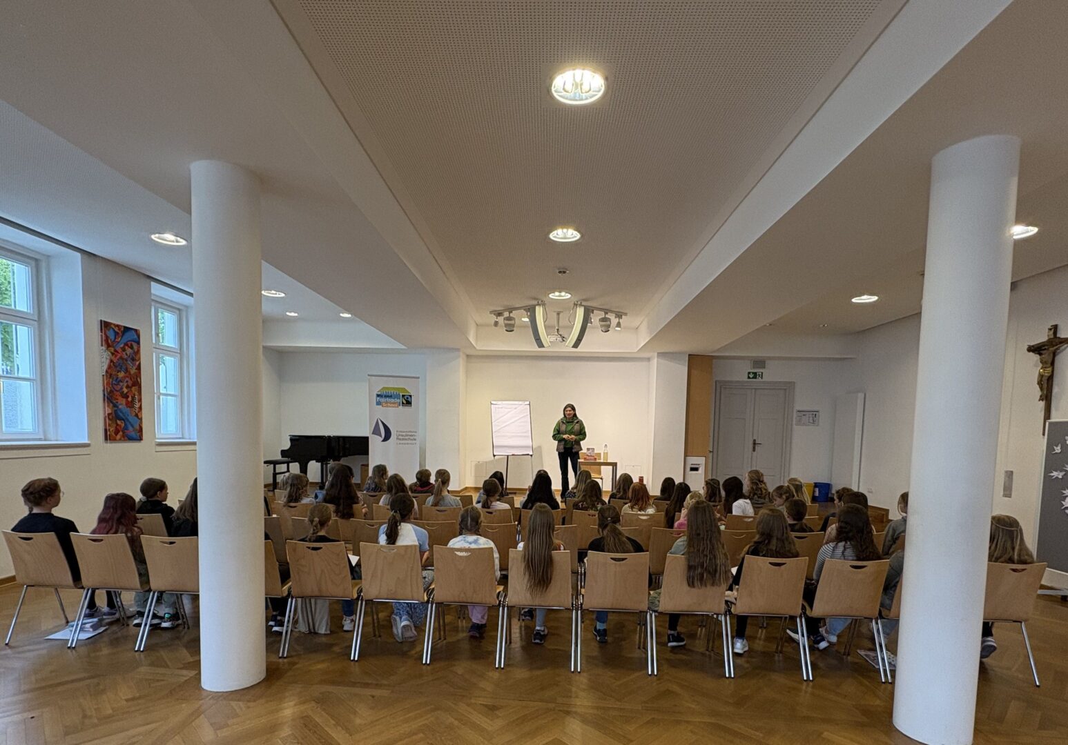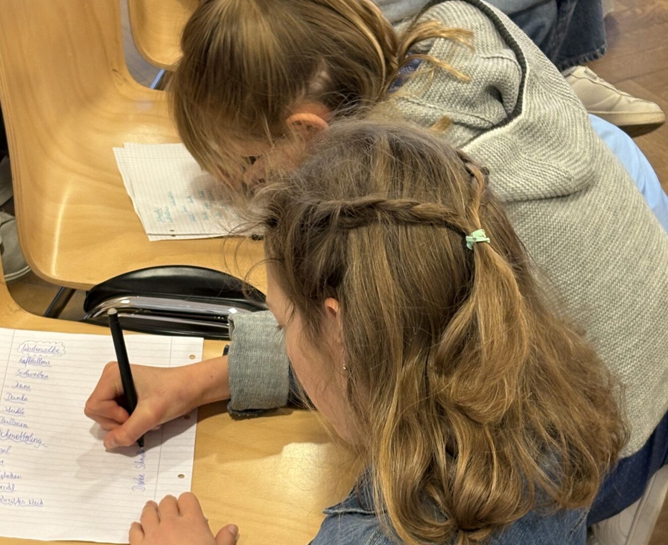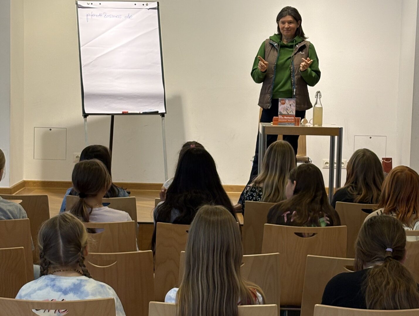 Claudia Götz erklärte den Mädchen, wie man sich besser auf etwas konzentrieren kann, seine Gedanken sortiert und so auch während Schulaufgaben den Fokus auf die Bearbeitung legen kann. Sie beantwortete alle Fragen ausführlich und erweckte dann mit Schreibübungen wie der „Wörterwolke“ oder dem „Zimmerrundgang“ in den Schülerinnen Ideen, die man nicht nur als Autorin braucht, sondern auch ganz wunderbar bei Schul- oder Hausaufgaben anwenden kann.